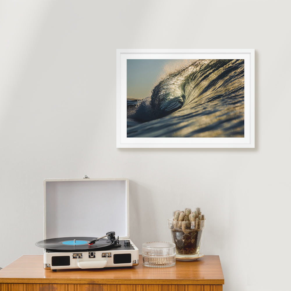 Displayed in a deep white frame; there is a gap between print and glass/perspex.